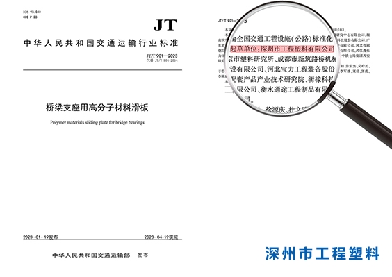 由我公司主持、桥梁建设行业中具有代表性的骨干企业参与编写的中华人民共和国交通运输行业标准《桥梁支座用高分子材料滑板》(JT/T 901-2023),已于2023年1月19日发布,将于2023年4月19日正式实施。